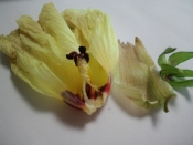 花オクラ 天ぷら- 花オクラの天ぷら ガクを残して下処理した花オクラの花びらの部分に薄く衣をつけ、さっと揚げます。 食べるときはガクは食べません。 塩や天つゆでいただくと、サクッ、モチっとしていて、とっても美味しいんです! 花オクラの収穫です。 大きな花オクラを見ていると~ クルクル回る~風車のようにも見えませんか? 長径30センチには、及びませんが~なかなか大きな花びらに感動~!! 一般的な食べ方には・・三杯酢やお浸し・天ぷらなどで♪ 花オクラの酢の物